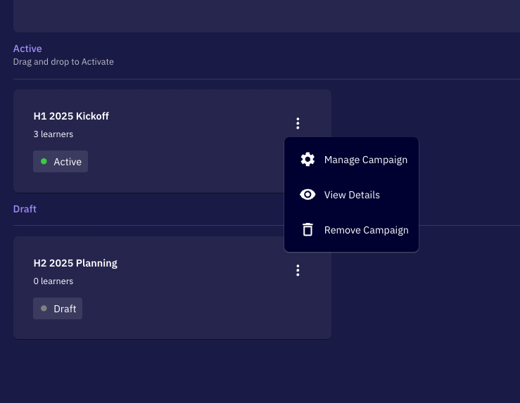 You can delete a campaign at any time. Note that doing this will remove any progress data for any live campaigns, including all programs within the campaign which will be deleted as well.