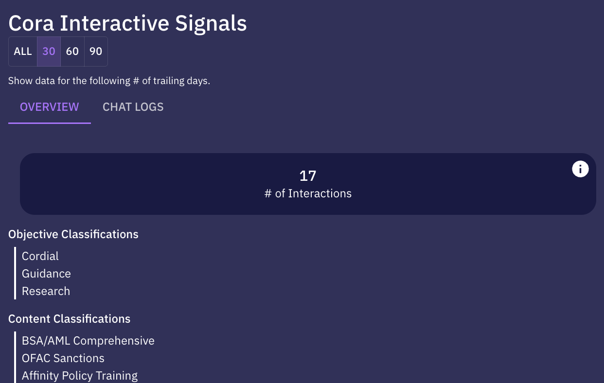 We mentioned that some details of learner interactions with Cora are available in the Radar Dashboard. What is included here is a summary of the topics learners are chatting about as well as raw chat logs which you can look up for any learner.
