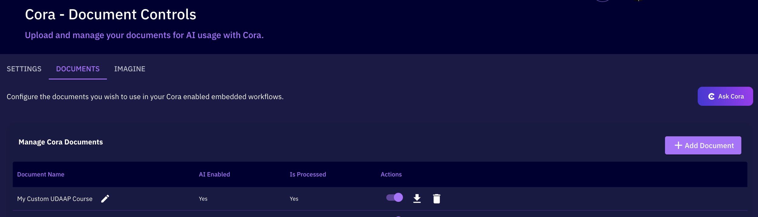 Once uploaded, you can then toggle the enablement as well as delete it if you choose. Disabling or deleting the document will remove it from the Cora system within 1 to 10 minutes.