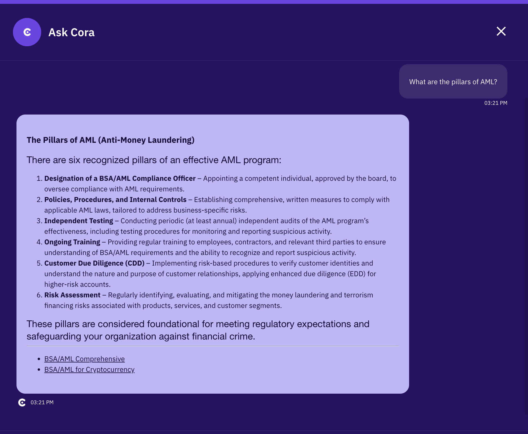 You can enable Cora for use for your learners. When enabled they will be able to ask Cora for guidance in real time about situations, questions, and research. This means instead of learners wasting valuable time chasing down an answer, rereading the policies, or possibly giving a wrong answer - they can get accurate real time guidance and waste no time.