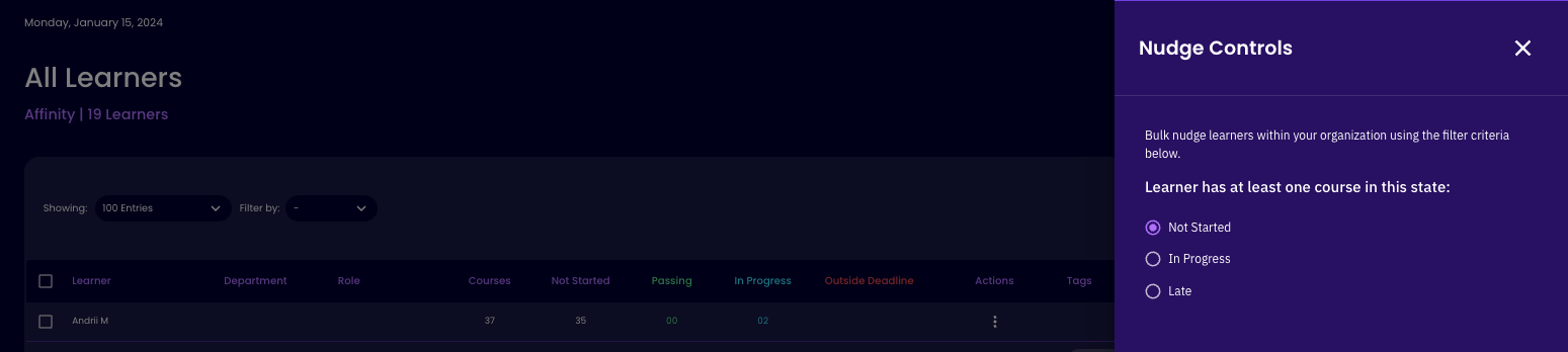 You can also nudge your entire organization across all active trainings based on the learners status with that training. This is a helpful workflow as opposed to drilling into each training you have active, you can do it all at once.