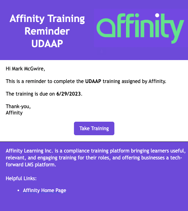 When nudged, learners will get an email like the following. If they have more than one training that was nudged, they will see all of the trainings in one email. We try to coalesce the emails as best as possible depending on the timing of the nudges.