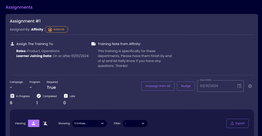To fulfill the training from the sponsor organization, assign the targeted learners to it and use the tools within the Affinity platform to ensure those learners take, pass, and complete the assignment.